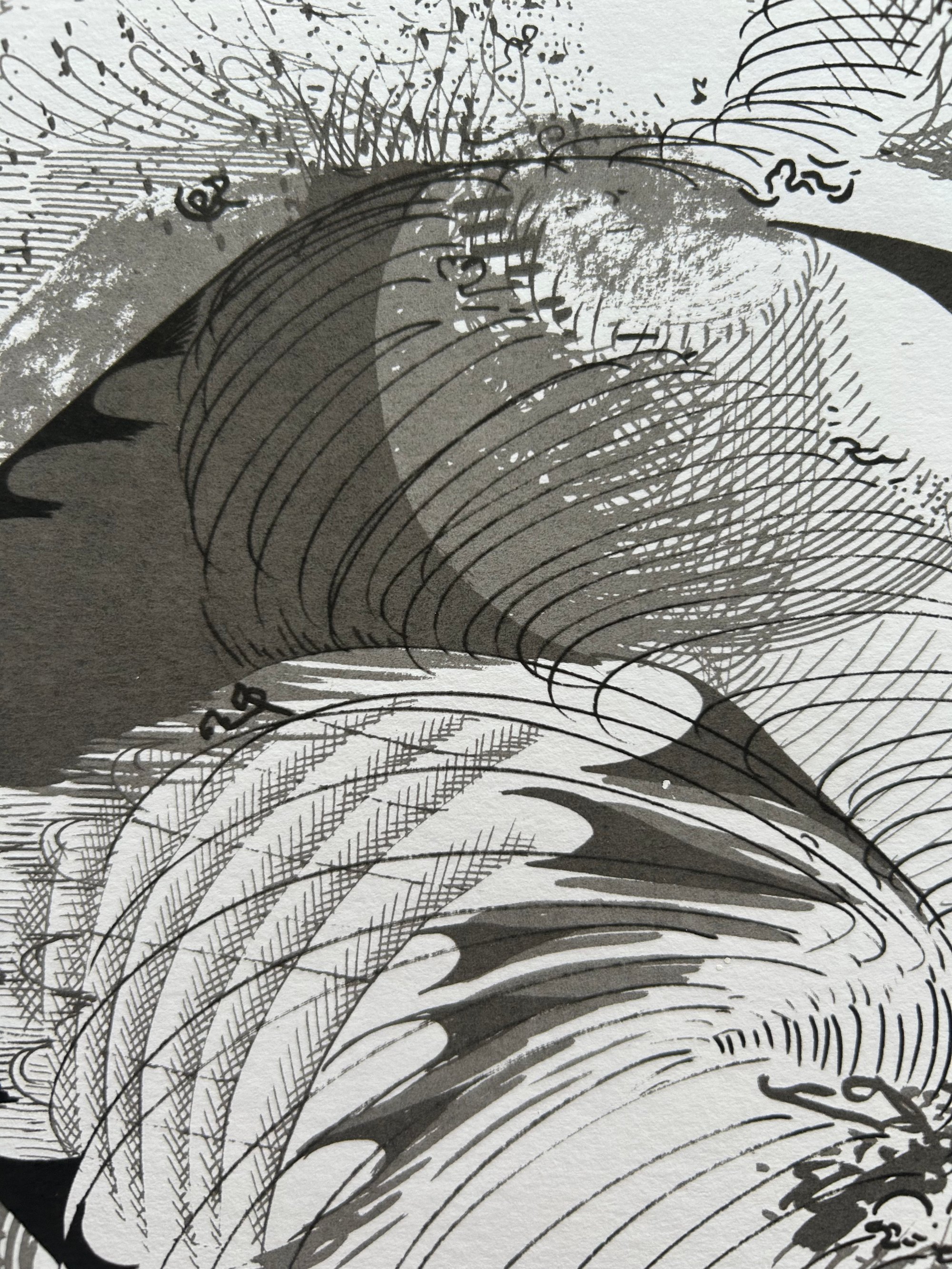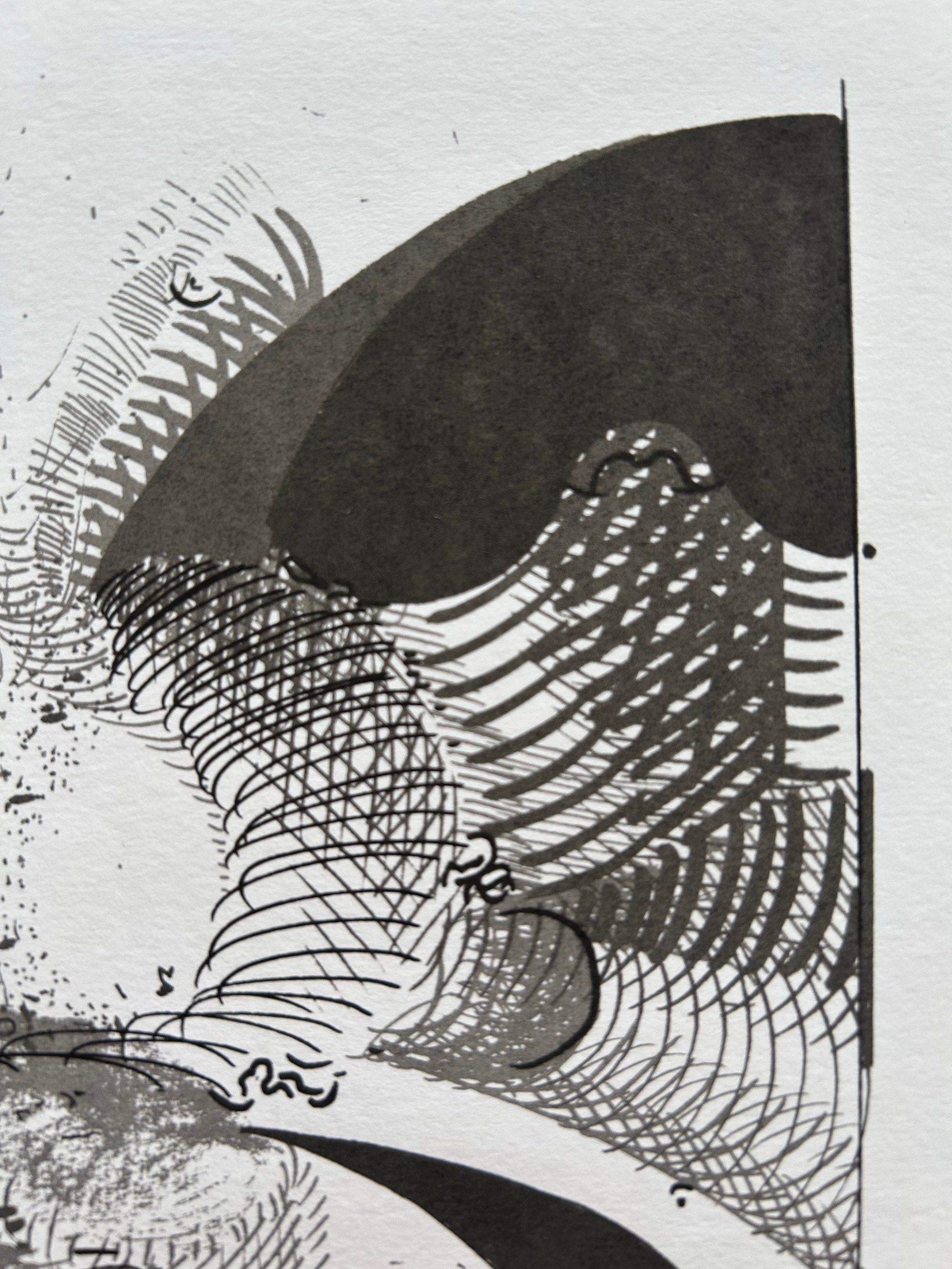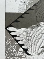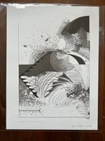 Super limited screen print edition using photocopy toner in acrylic medium. The idea was to record the growth of the drawing and translate into print. The drawing was scanned at intervals during it's development, then each stage used as a separation and printed using a consistent tone, so that the oldest parts of the drawing build up to make darker tones and the last stages of the drawings development are rendered in the lightest tones.