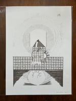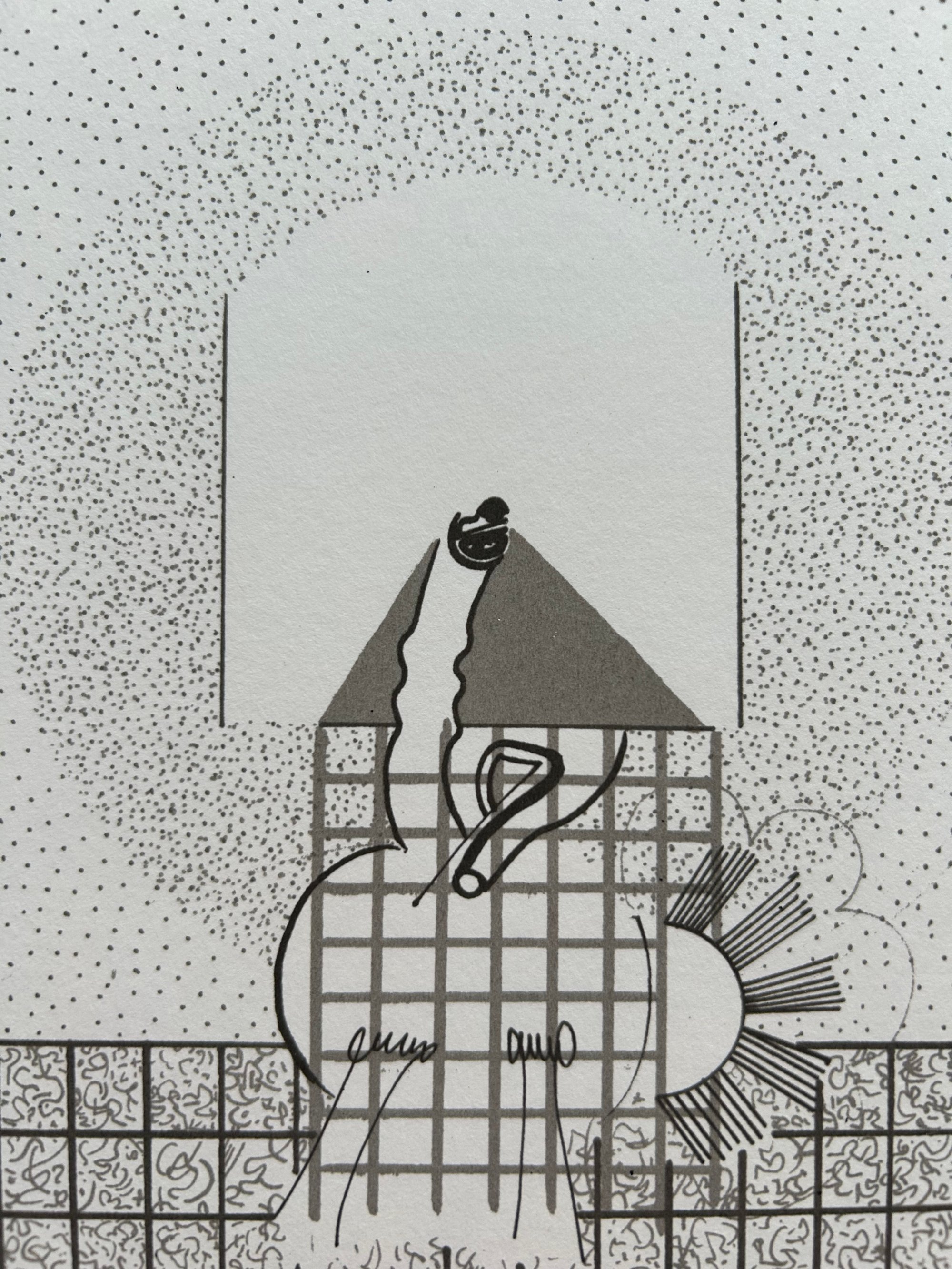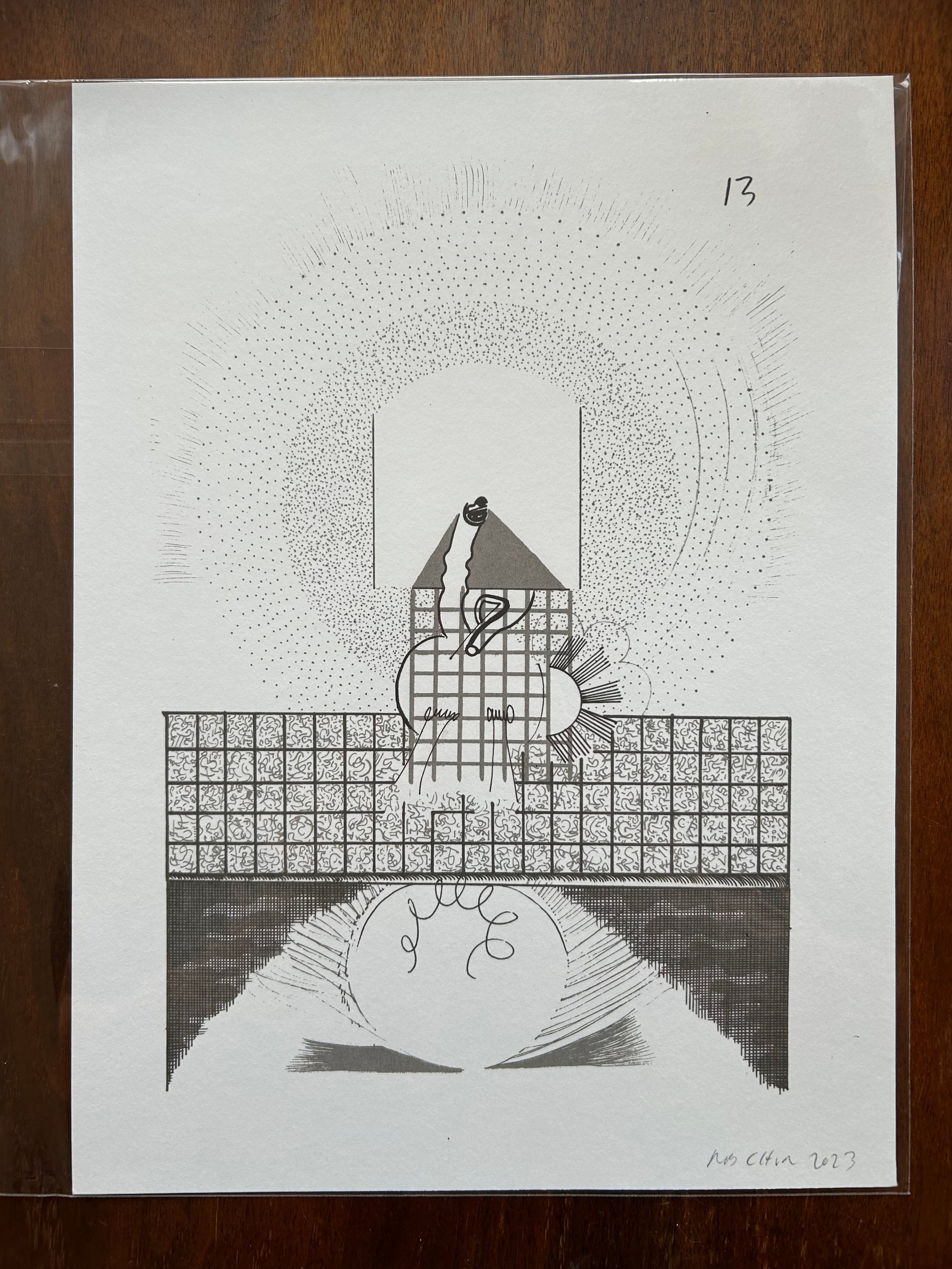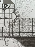 Super limited screen print edition using photocopy toner in acrylic medium. The idea was to record the growth of the drawing and translate into print. The drawing was scanned at intervals during it's development, then each stage used as a separation and printed using a consistent tone, so that the oldest parts of the drawing build up to make darker tones and the last stages of the drawings development are rendered in the lightest tones.