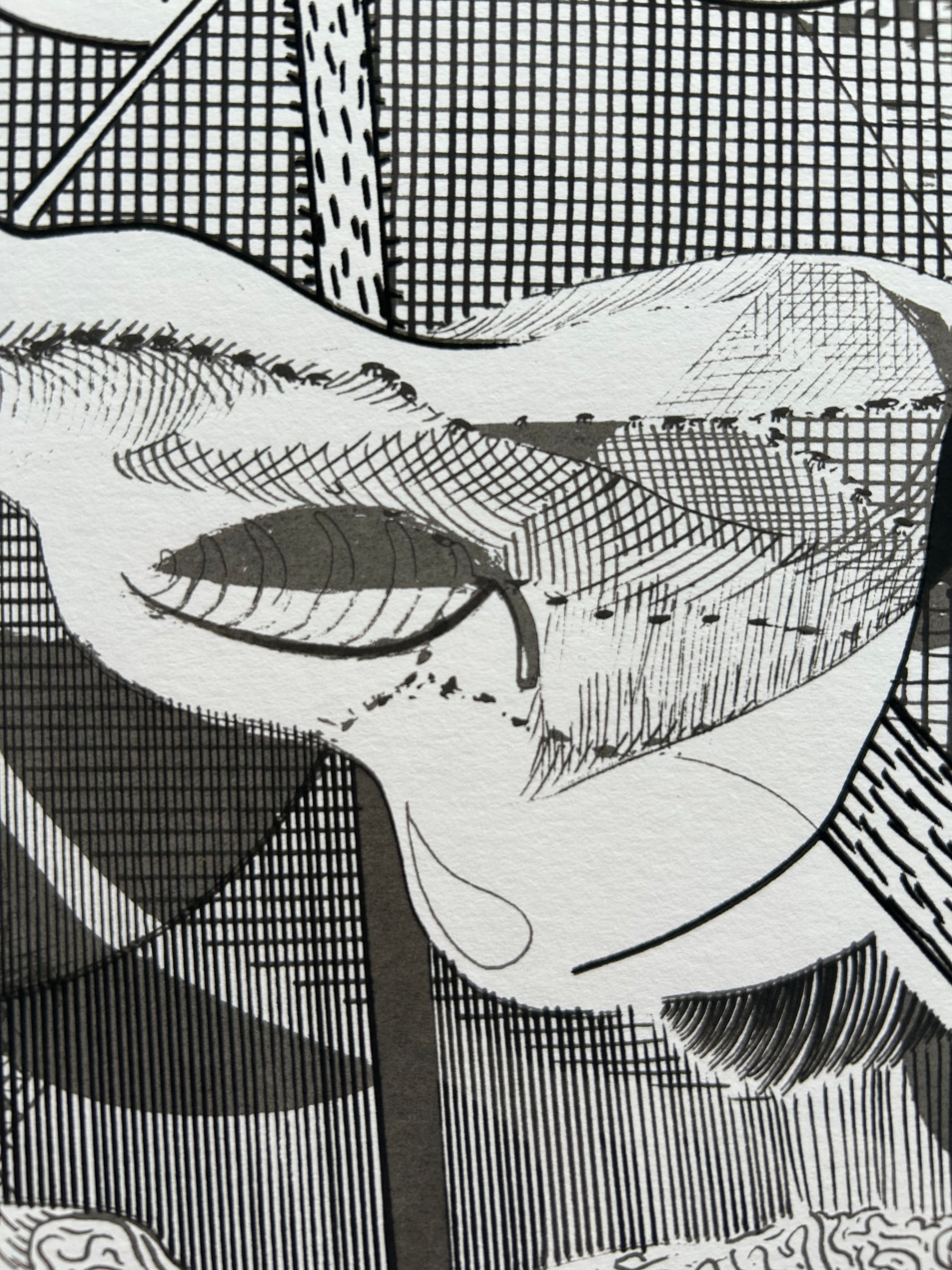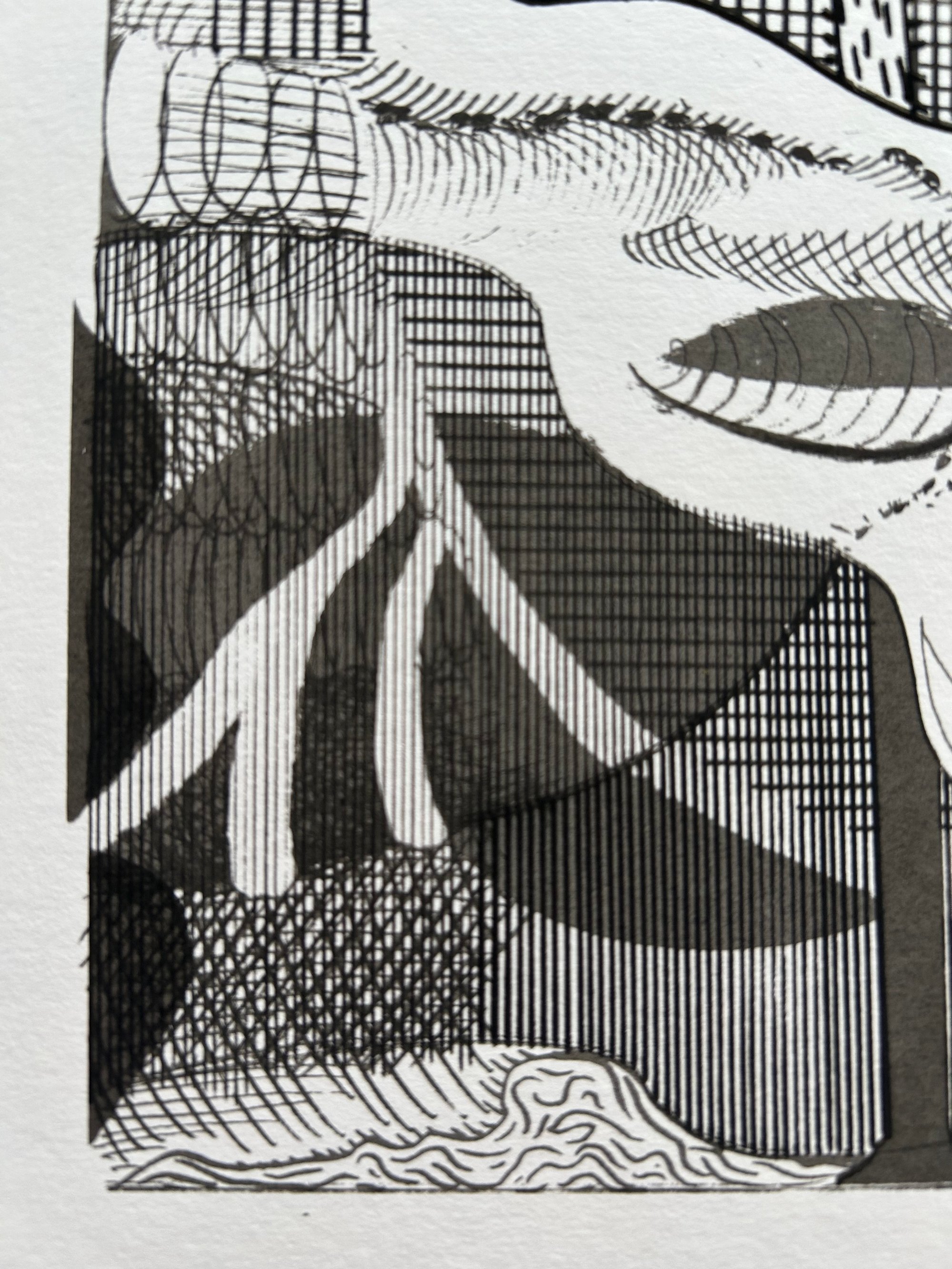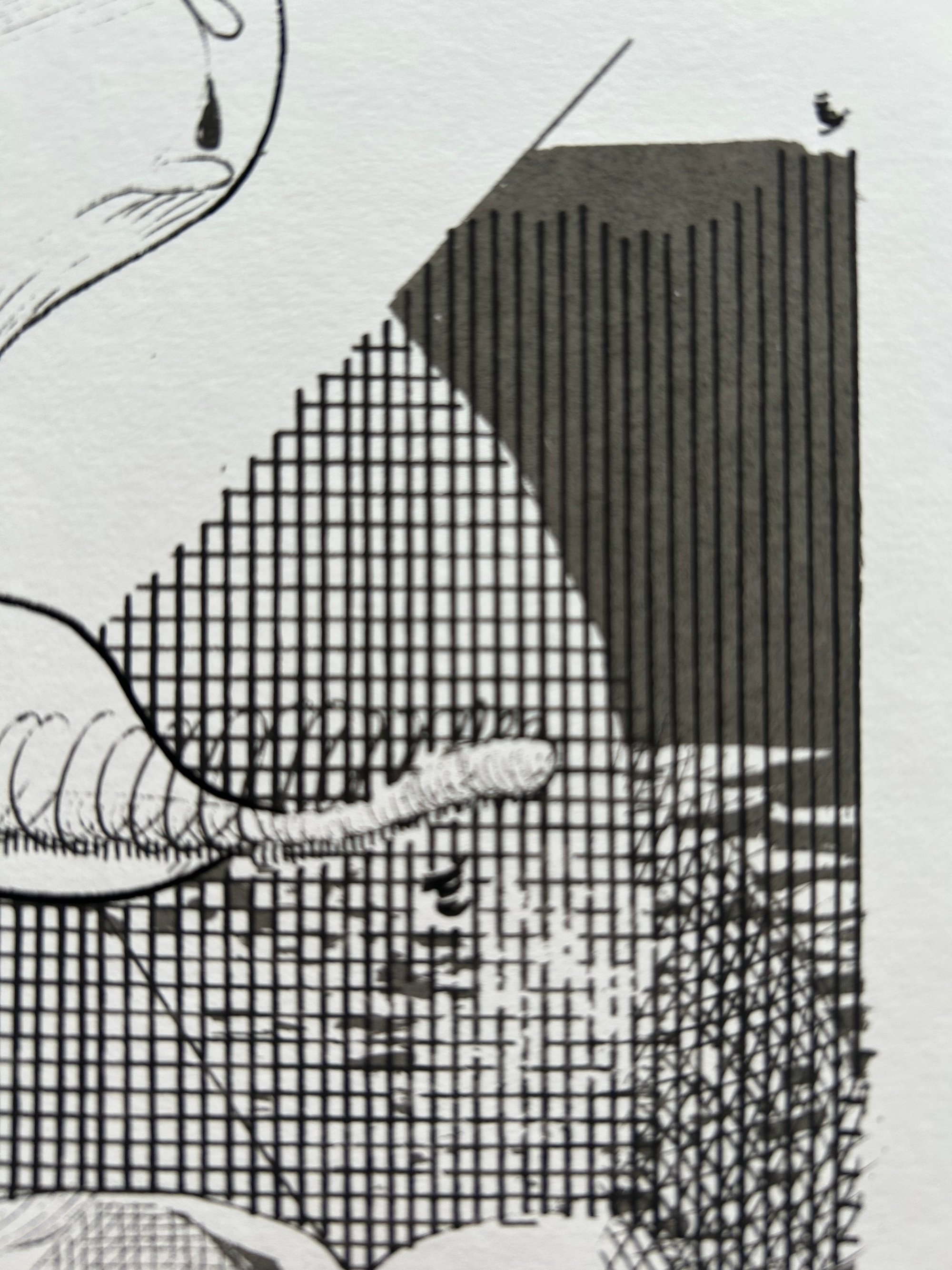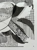 Super limited screen print edition using photocopy toner in acrylic medium. The idea was to record the growth of the drawing and translate into print. The drawing was scanned at intervals during it's development, then each stage used as a separation and printed using a consistent tone, so that the oldest parts of the drawing build up to make darker tones and the last stages of the drawings development are rendered in the lightest tones.